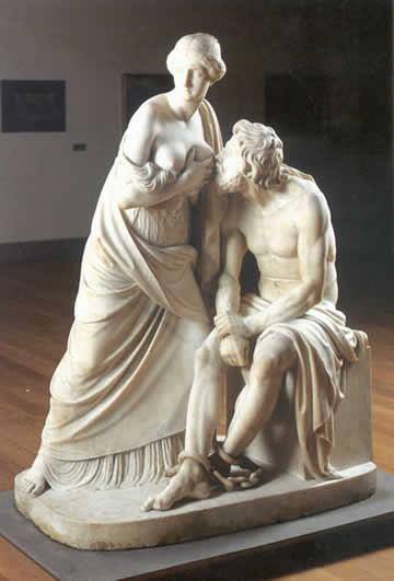 La caridad romana Antoni Solá El catalán Antonio Solá (1787-1861) es uno de los escultores neoclásicos españoles más destacados. En esta obra trata una popular leyenda de origen helenístico. En ella el anciano Cimón ha sido encerrado y condenado a morir de hambre; sin embargo, su hija, Pero, lo mantiene con vida amamantándolo a escondidas durante sus visitas a la cárcel. La caridad romana es una alegoría de la devoción filial y, como la escultura clásica, intenta aunar los valores morales con los estéticos. Solá sigue los cánones clasicistas del teórico Lessing Winckelmann y utiliza el mármol blanco pulimentado como soporte de unas figuras de belleza idealizada y serena. El mármol blanco era considerado el material idóneo para plasmar la belleza, ya que se creía que las estatuas griegas originales tenían ese aspecto, cuando, en realidad, estaban policromadas. Formalmente encontramos un minucioso estudio del desnudo natural, con una pureza de líneas que alcanza niveles de virtuosismo. La figura humana desnuda fue el tema preferido de neoclásicos y academicistas, con el que querían expresar el ideal del alma, pura y sin artificios. |